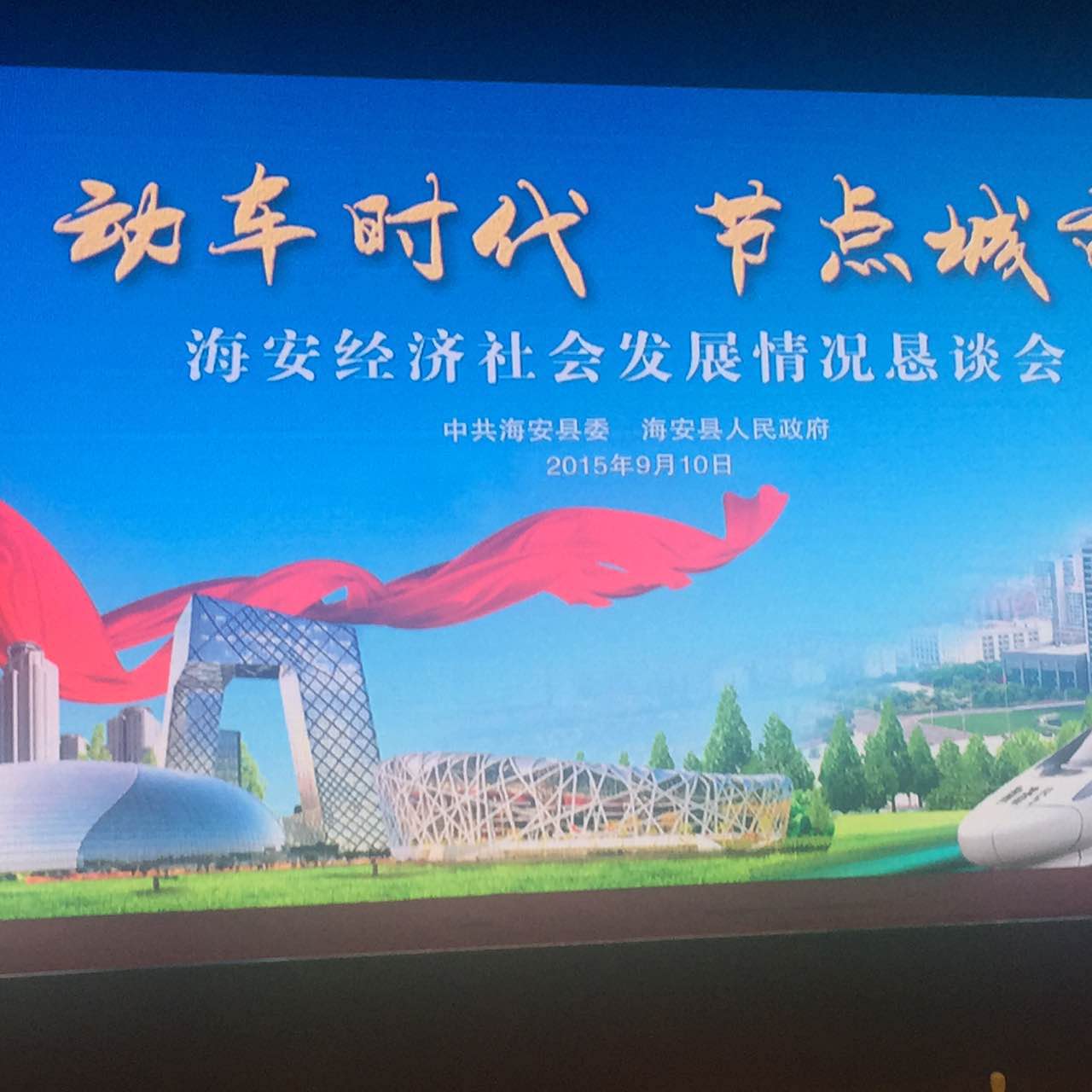 2015年9月10日,我公司總經理傅士超參加了我縣假座北京國際會議中心的“動車時代、節點城市”海安經濟社會發展情況懇談會,出席此次會議的有:中科院院士、中科院地理科學與資源研究所副所長、博士生導師周成虎,意大利對外貿易委員會駐中國辦事處副代表費立波,日中經濟貿易中心中國總代表田淵真次,北京礦冶研究總院總會計師劉顯清,中國長江三峽集團國際投資有限公司總經理陸國俊,以及在京工商界、政府機關、高等院校、科研機構、駐華領事館、海外工商組織駐華代表處、國際知名律師事務所的領導、專家,共300多位嘉賓。海安縣委書記陸衛東,縣委副書記、縣長顧國標,縣政協主席周宗泉等負責人參加,會議由海安縣副縣長嚴長江主持。