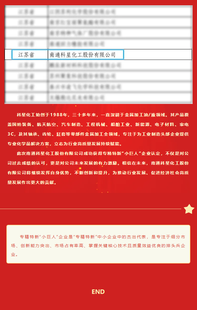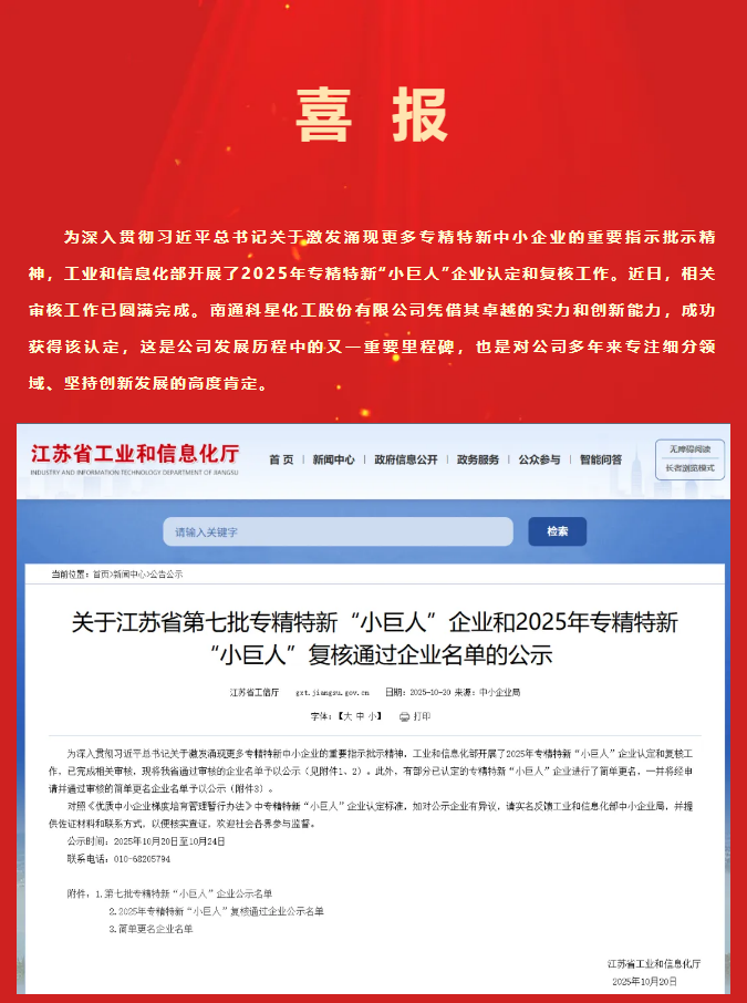 喜報!南通科星化工股份有限公司榮獲國家專精特新“小巨人”企業認定